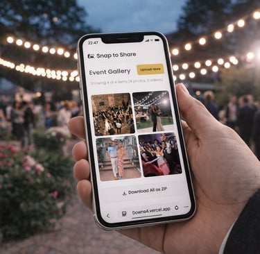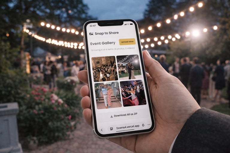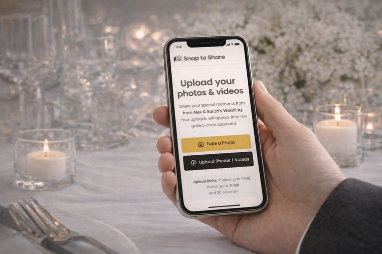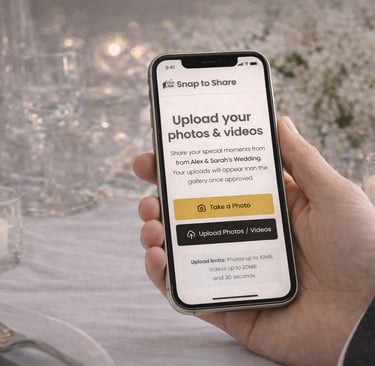 From morning prep to the last dance, your guests are already taking photos and videos. Snap to Share gives them one simple place to send everything — so nothing gets lost in group chats, forgotten on phones, or disappears after the day.