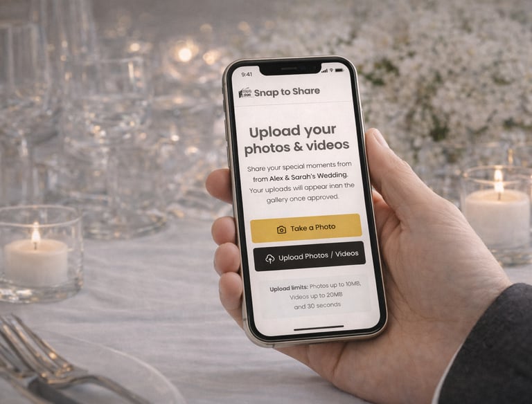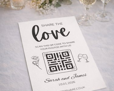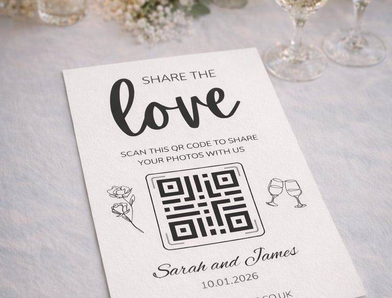 Starting from 50 Beautiful printed table cards with QR codes so guests can upload photos and videos instantly.